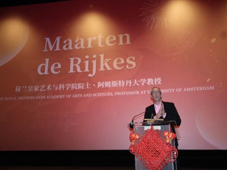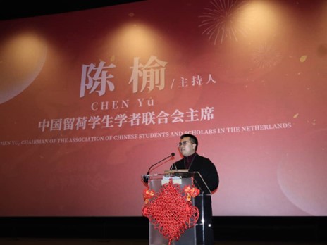安德里斯·梅耶林克和马尔滕·德·赖克两位教授围绕自身科研领域和国际交流合作经历,先后发表致辞并与现场观众深入交流。两位教授一致表示,中荷科研合作不仅推动了学术创新,也在长期交流中加深了彼此的信任与友谊。面向未来,他们期待与中国同行在更广领域、更深层次持续深化合作,共同培养具有国际视野的青年人才,为应对全球性挑战、促进人类社会可持续发展贡献更多智慧与力量。全荷学联主席陈榆主持了开幕式。他表示,全荷学生学者春节联欢会不仅是一场新春文化盛会,更是中荷学子相聚交流、彼此支持的重要平台。未来,全荷学联将继续以服务在荷中国学生学者为核心使命,推动中荷青年交流与人文合作,在文明互鉴中贡献更加积极、务实的力量。